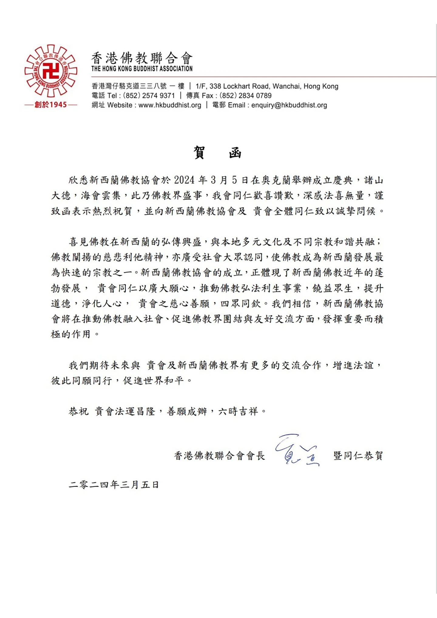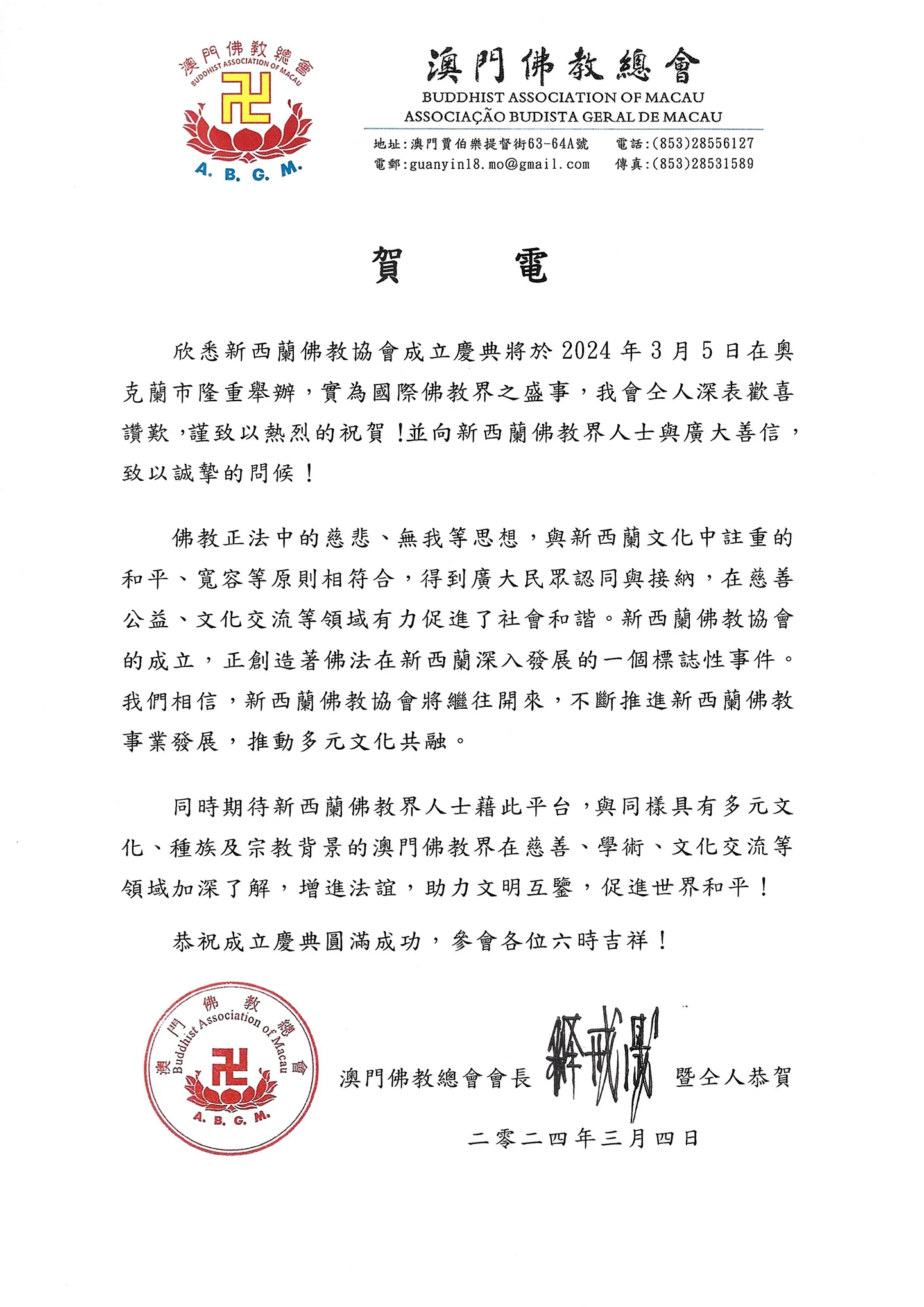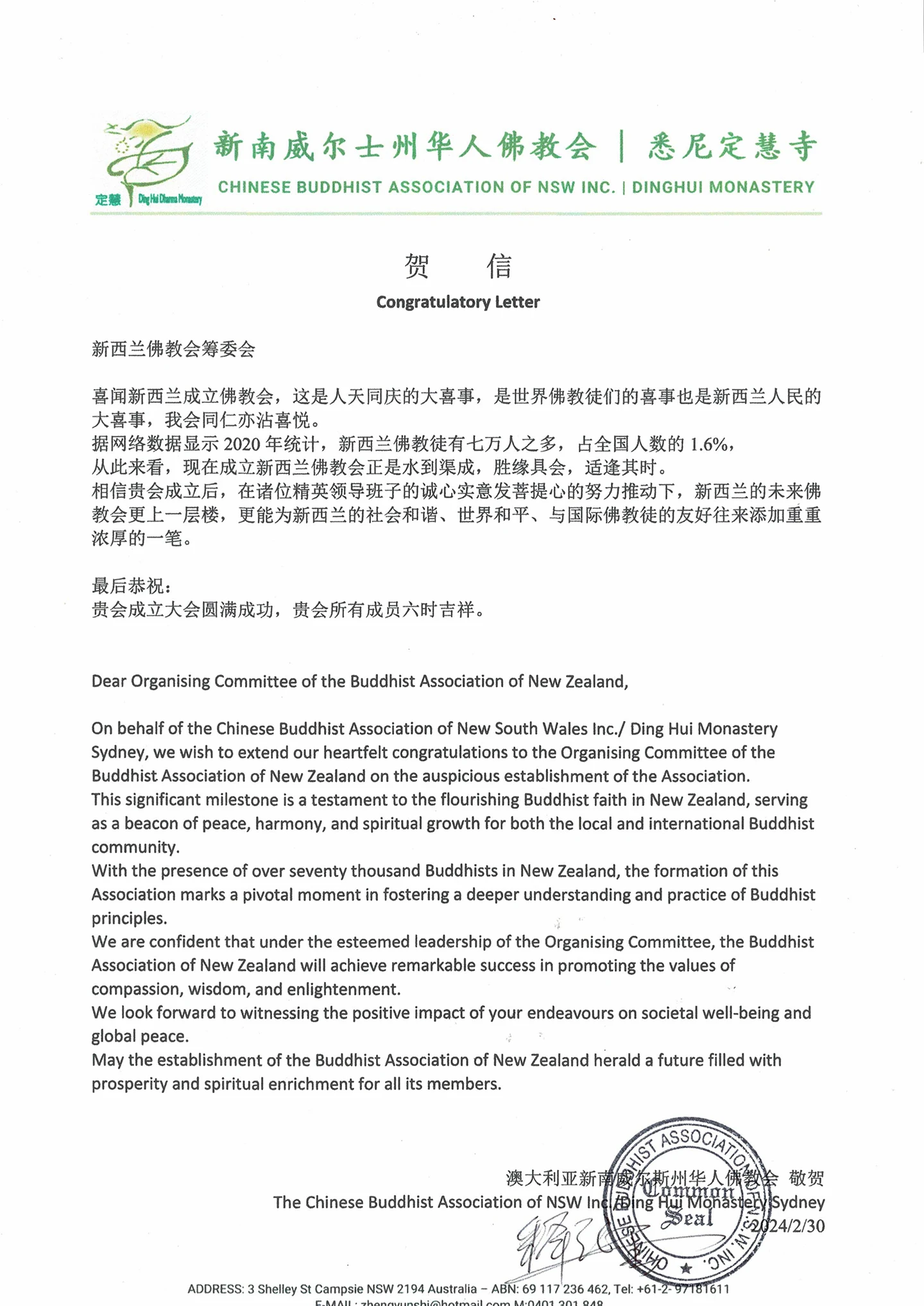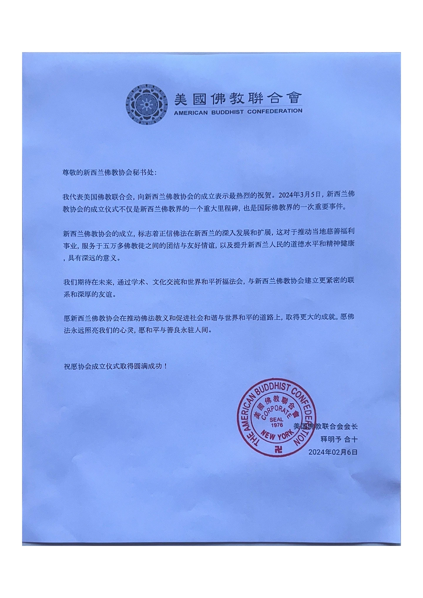 这次新西兰佛教协会的成立,还收到了来自世界各国的佛教会的贺信,有中国佛教协会,加拿大佛教会,美国佛教联合会,澳大利亚新南威尔士州华人佛教会,菲律宾佛教联合会,台湾中国佛教会,香港佛教联合会,澳门佛教总会以及日本佛教组织。各国相对应的大和尚们上台现场宣读了这些贺信。