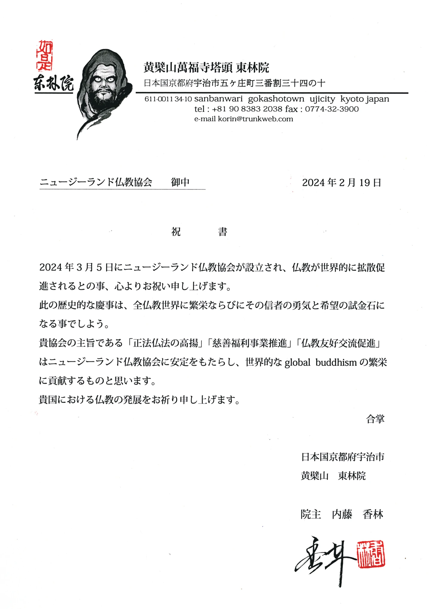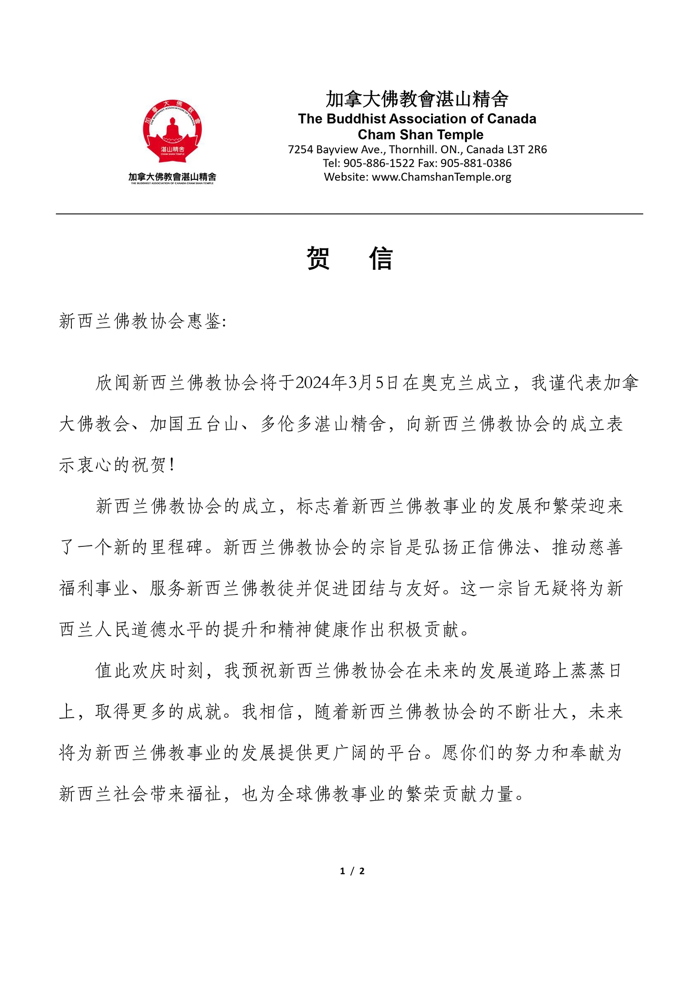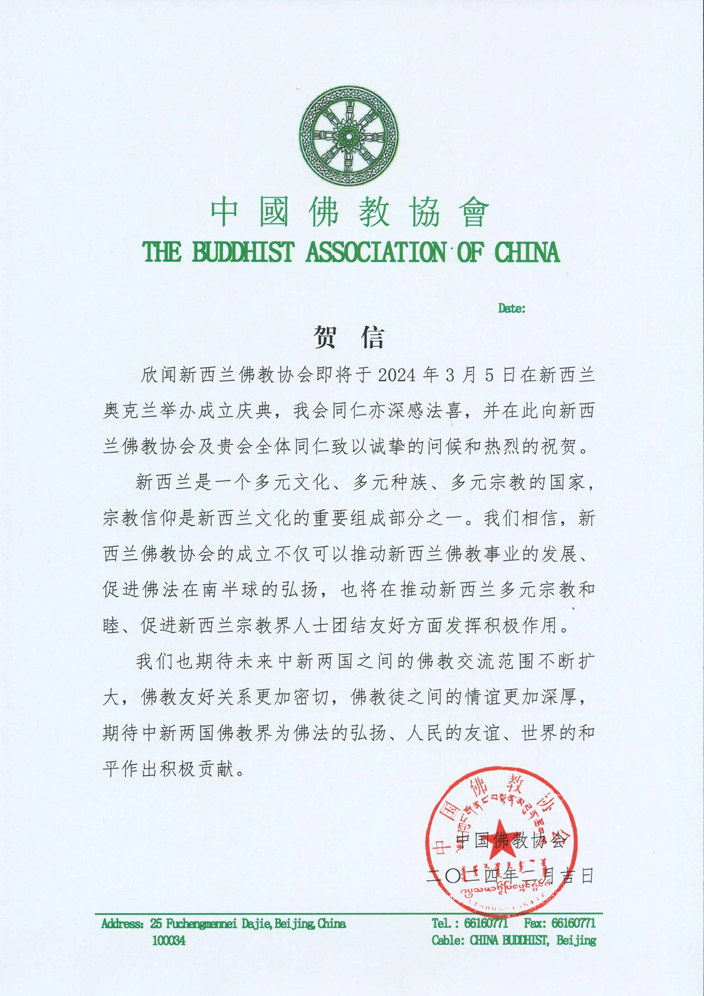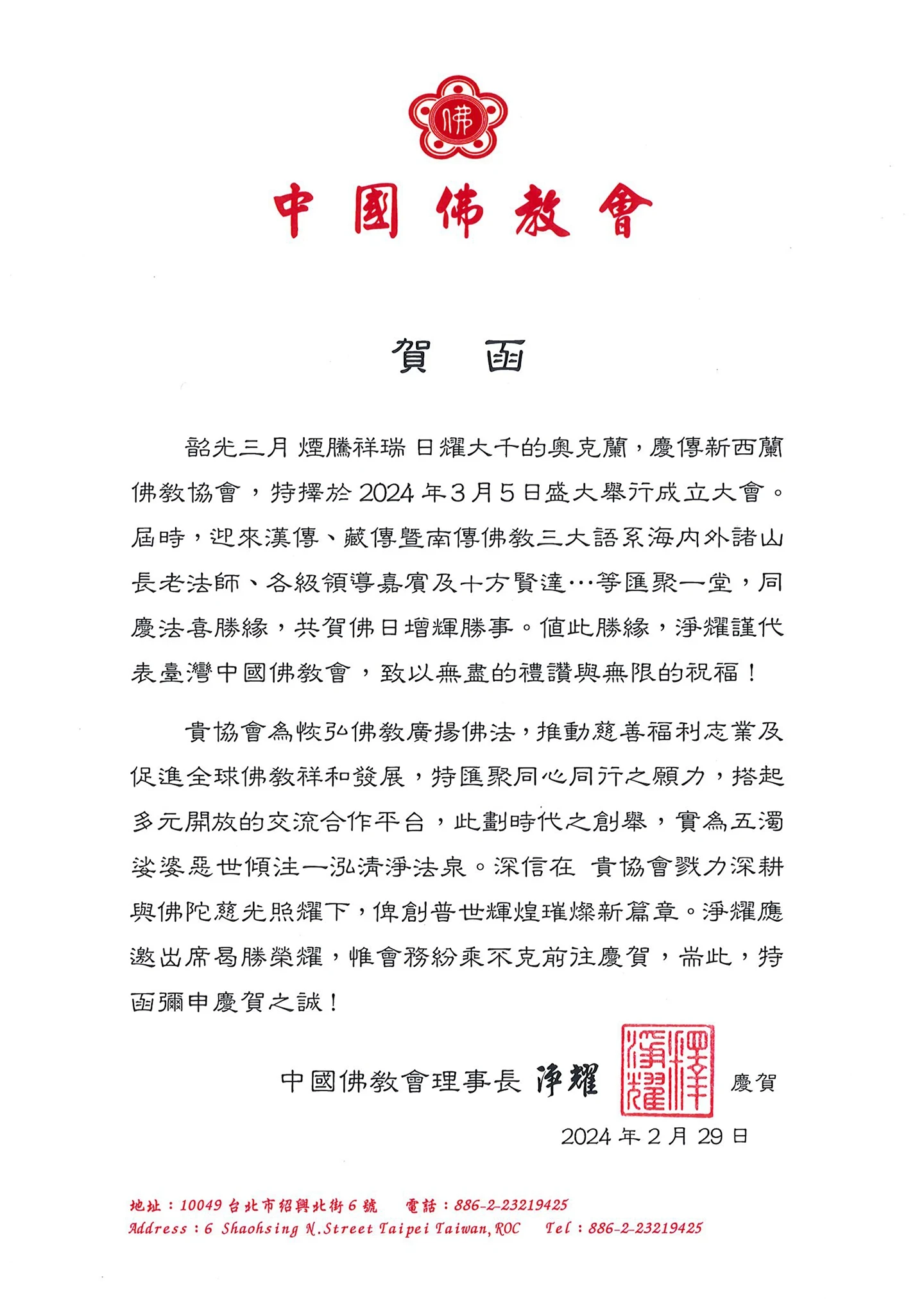这次新西兰佛教协会的成立,还收到了来自世界各国的佛教会的贺信,有中国佛教协会,加拿大佛教会,美国佛教联合会,澳大利亚新南威尔士州华人佛教会,菲律宾佛教联合会,台湾中国佛教会,香港佛教联合会,澳门佛教总会以及日本佛教组织。各国相对应的大和尚们上台现场宣读了这些贺信。