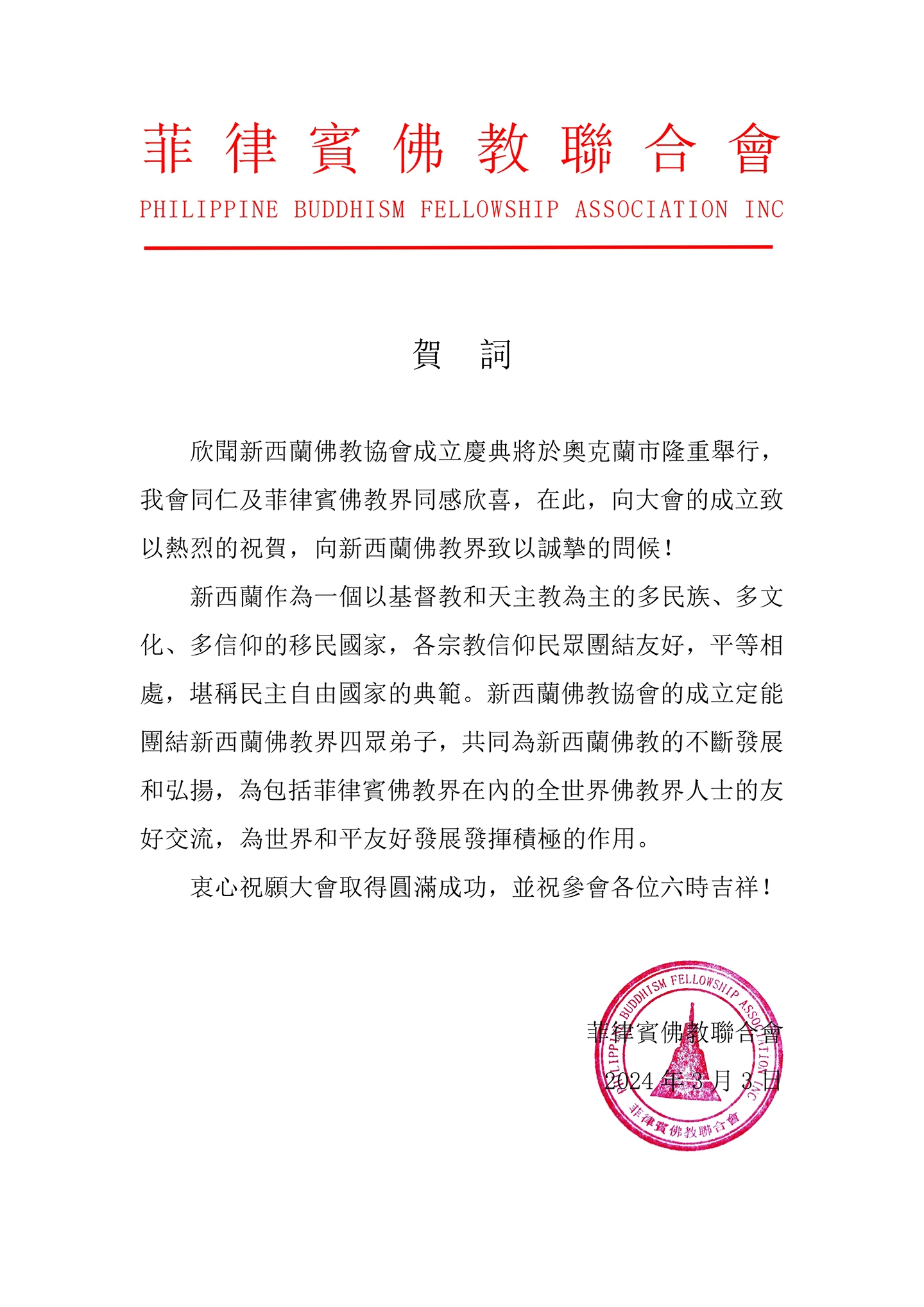 这次新西兰佛教协会的成立,还收到了来自世界各国的佛教会的贺信,有中国佛教协会,加拿大佛教会,美国佛教联合会,澳大利亚新南威尔士州华人佛教会,菲律宾佛教联合会,台湾中国佛教会,香港佛教联合会,澳门佛教总会以及日本佛教组织。各国相对应的大和尚们上台现场宣读了这些贺信。
